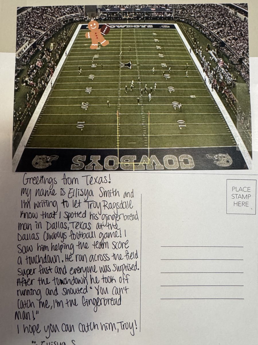 Mrs. Pigg’s class read several versions of the tale over the course of a unit on storytelling. They discussed the different story elements between the tale’s many versions. To aid in student excitement, Mrs. Pigg asked her parents to share a letter with friends from around the world, asking them to send postcards from their location indicating that the Gingerbread Man had been spotted there.